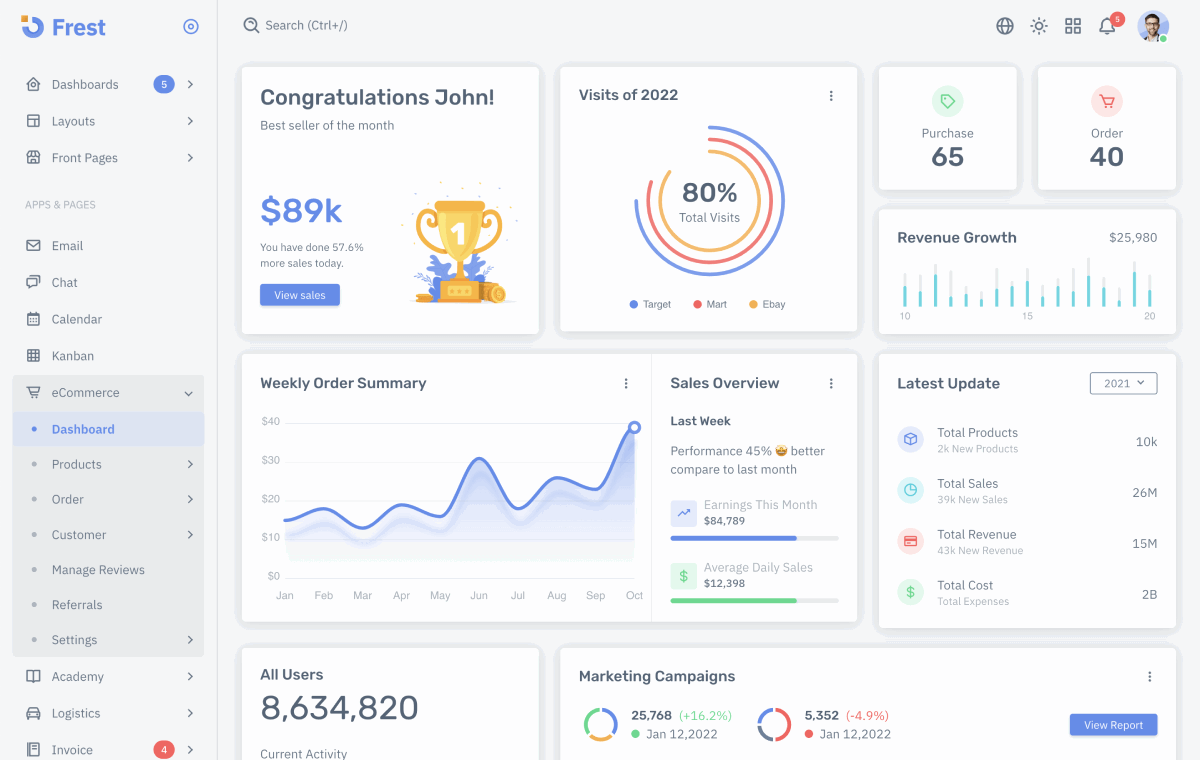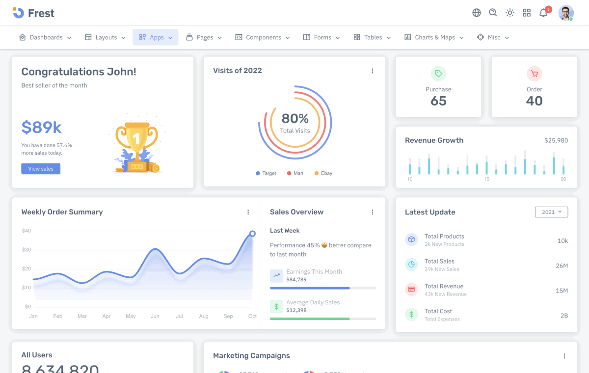 Frest Admin Template additionally provides 10 different applications which enable you to