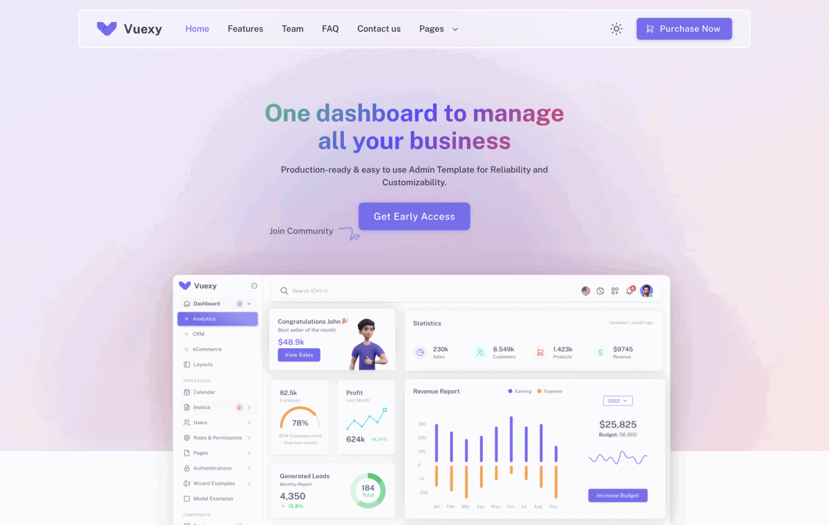 Vuexy Admin template provides 15+ front pages, including a dedicated landing page and other most