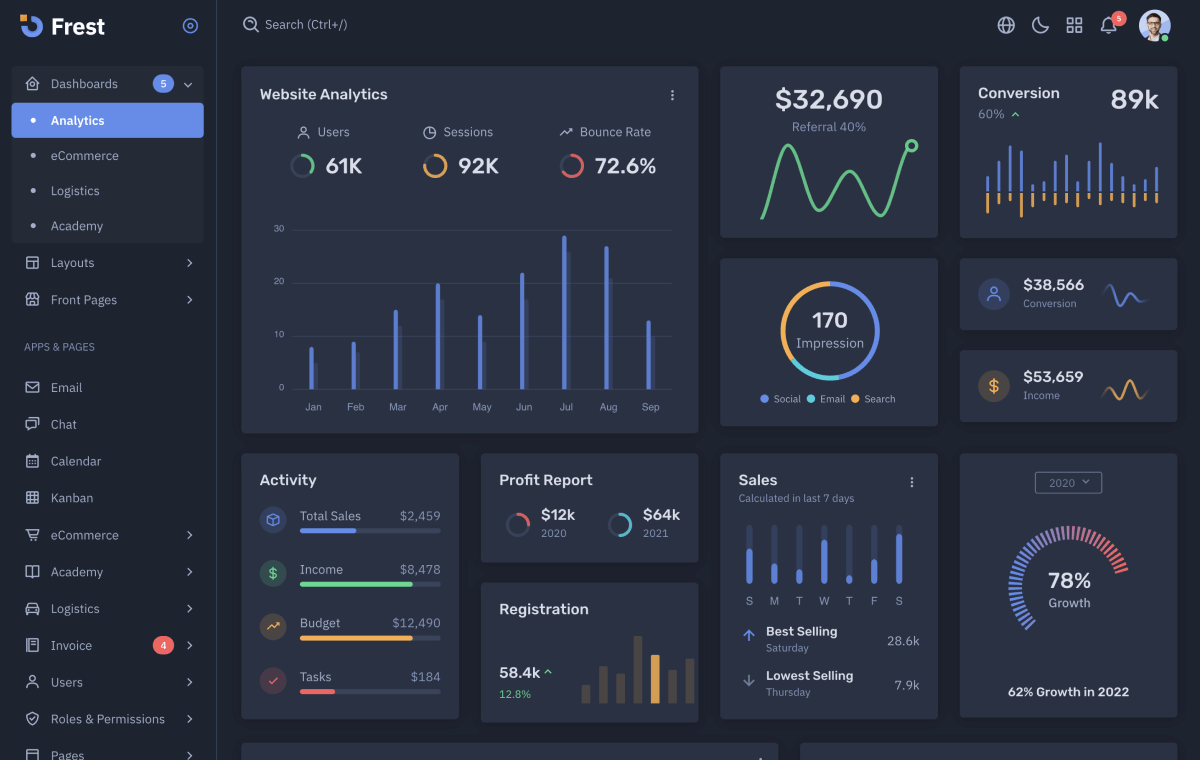 Frest Admin Template additionally provides 10 different applications which enable you to